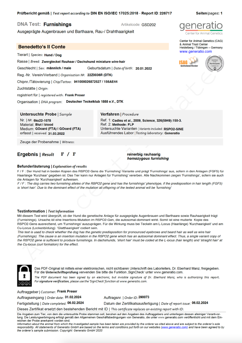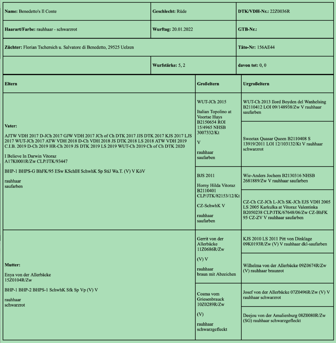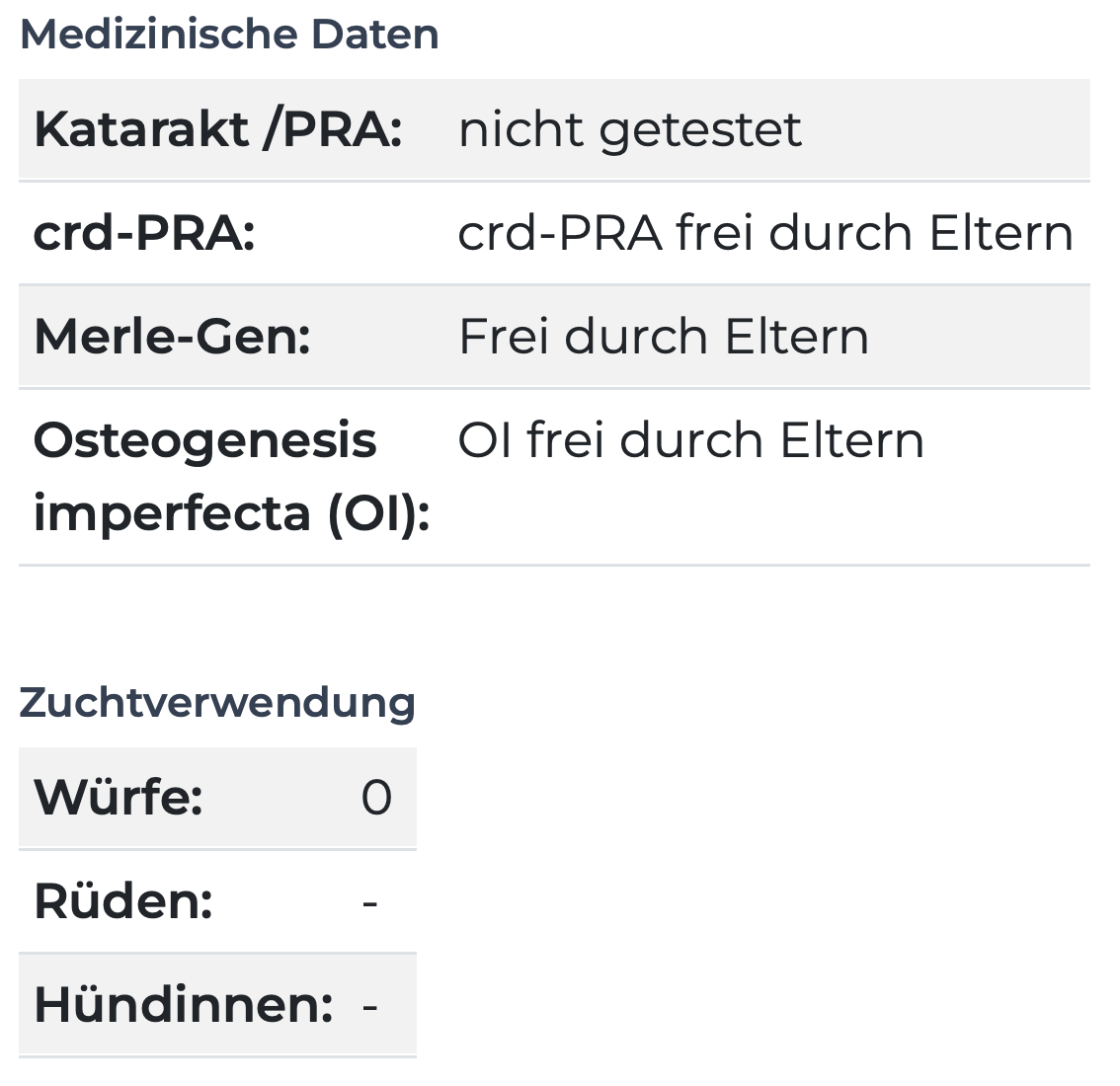 Da ich mir als potentieller Deckrüde meiner Verantwortung bewußt bin, gebe ich nachfolgend meine medizinischen Daten bekannt. Weiterhin werden meine Zähne durch mein Herrchen gepflegt und Termine beim Veterinär eingehalten.